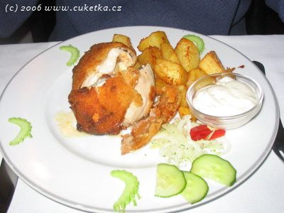 Nabídka specialit je poměrně široká, a jelikož o gruzínské kuchyni nemám ani páru, lehce jsem se v ní ztratil. Ceny jsou na Prahu v průměru tj. vyšší ;) Z nabídky jsme si vybrali Smaženou kuřecí kapsu za 145,- Kč (sázka na jistotu), z gruzínských specialit potom Baže (grilované kuře ve studené ořechové omáčce) za 135,- Kč s Gruzínským pečivem za 55,-Kč (ten velký placatý objekt na fotce ;)