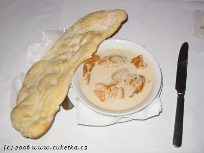 Kuřecí kapsa byla na jedničku, i když ne zrovna estetickou ;) Překvapení obstarala nakládaná (ostrá) cibulka v obloze – mňam! Grilované kuřecí v ořechové omáčce bylo výborné (hlavně ta omáčka!), na můj vkus však hodně slané. Úplně nadšený jsem byl z gruzínského pečiva alias chlebové placky. Byla krásně čerstvá a horká, z bílého mírně nakynutého těsta a rovněž zdravě posolená. Tuhle určitě doporučuji vyzkoušet ;)