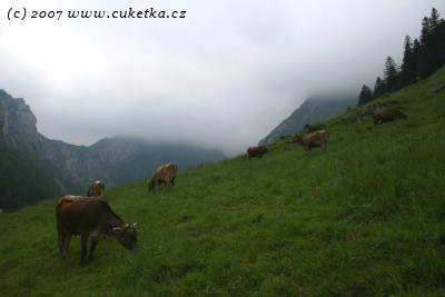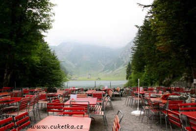 Seealpsee je malebné údolíčko s jezerem pod vrcholky Ebenalp a Santis. Asi po půlhodině ostřejšího výšlapu vás uvítají první pracovnice mlékařského byznysu. Nikam nespěchají. Vychutnávají si to.