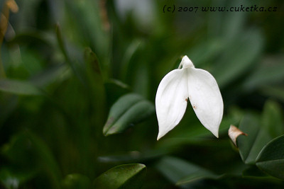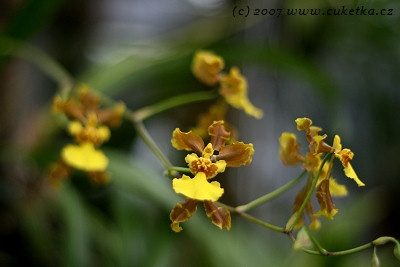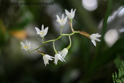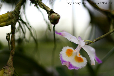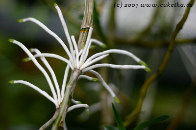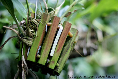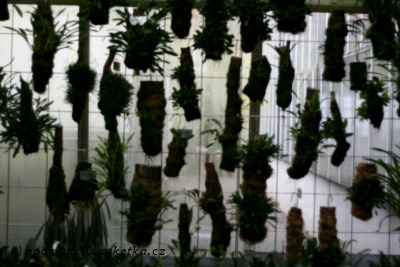 Potichu se přesuneme do království orchidejí. V úzké provětlené místnůstce jsou rozvěšeny všude kolem.