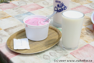 Zkusili jsme úžasný jahodový jogurt s nadpozemskou konzistencí (= oživlá laktoplazma), jeden shake a já jsem šel straight way se sklenicí čerstvého mléka. Usilovně jsem memoroval, jak chutná normální mléko pro návrat do Česka…
