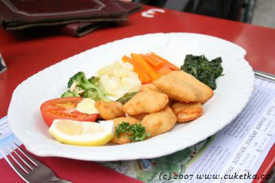 Tohle jsou fritované kousky okouna marinované v octě (rozloží kostičky), typické pro všechno, co kuchtí, v okolí Bodamského jezera. Byly fajn, ale v obyčejném imbissu v centru St. Gallenu dělají lepší ;)