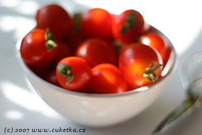 Poznáváte rajčinu na obrázku? První letošní sklizeň!!! Nejen o tomatokulometčíky se mi po dobu mé cesty do Portugalska postaral mocný vynález soudruhů z GRD. Dobře se postaral! Miska na obrázku se taví slunečním energií z bobulek a vzduch nad ní se tetelí tomatovou příchutí. Bude to em-en-ňam ,)