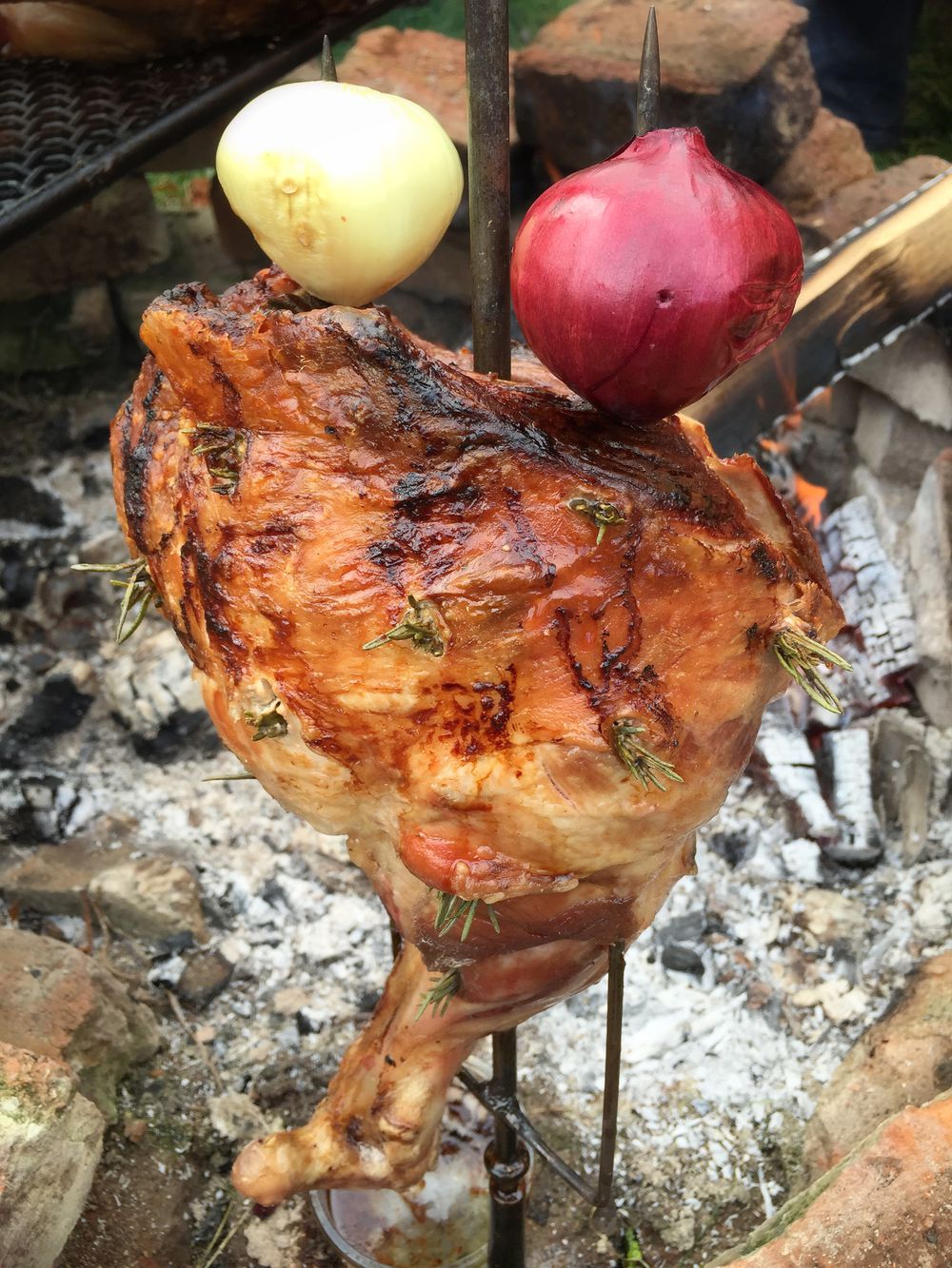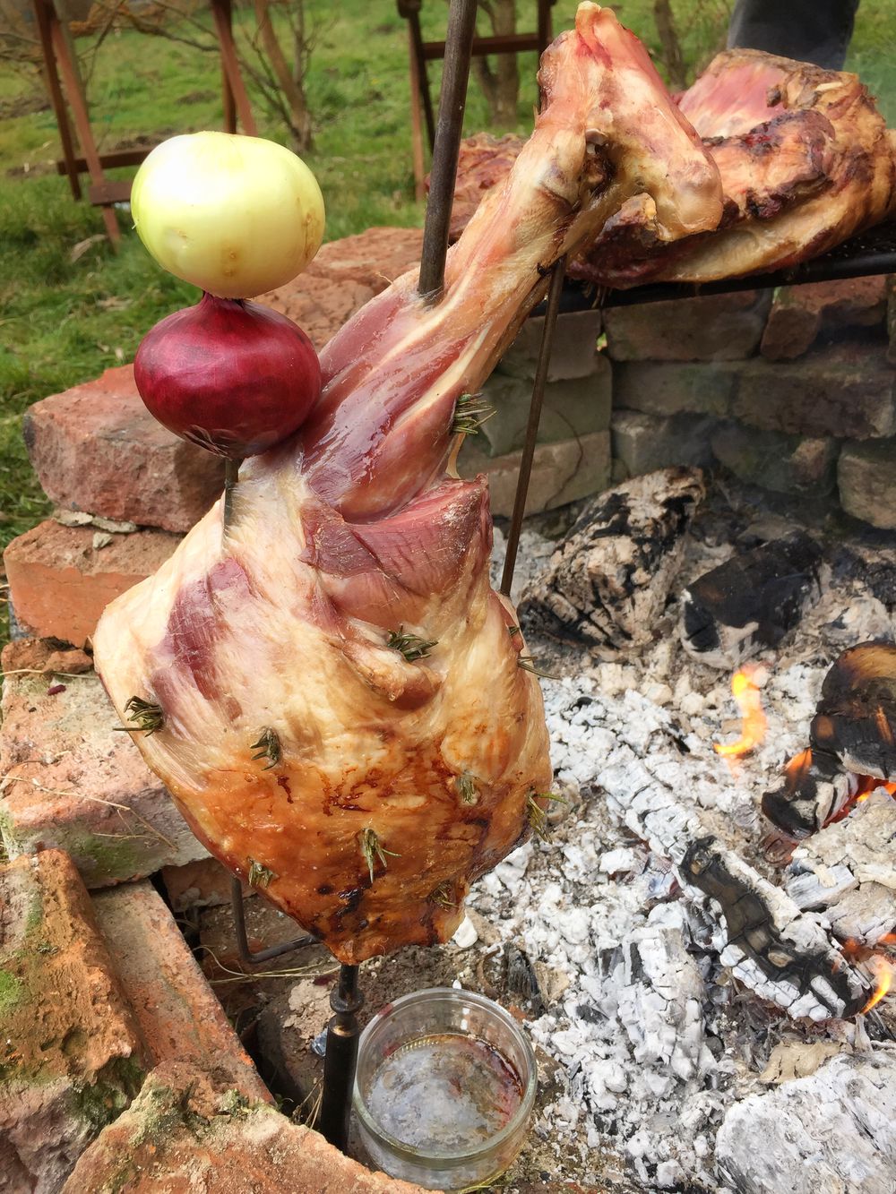 Mírný sklon, miska na sbírání tuku a žár z uhlíků. Špikováno rozmarýnem, česnekem a ančovičkami.