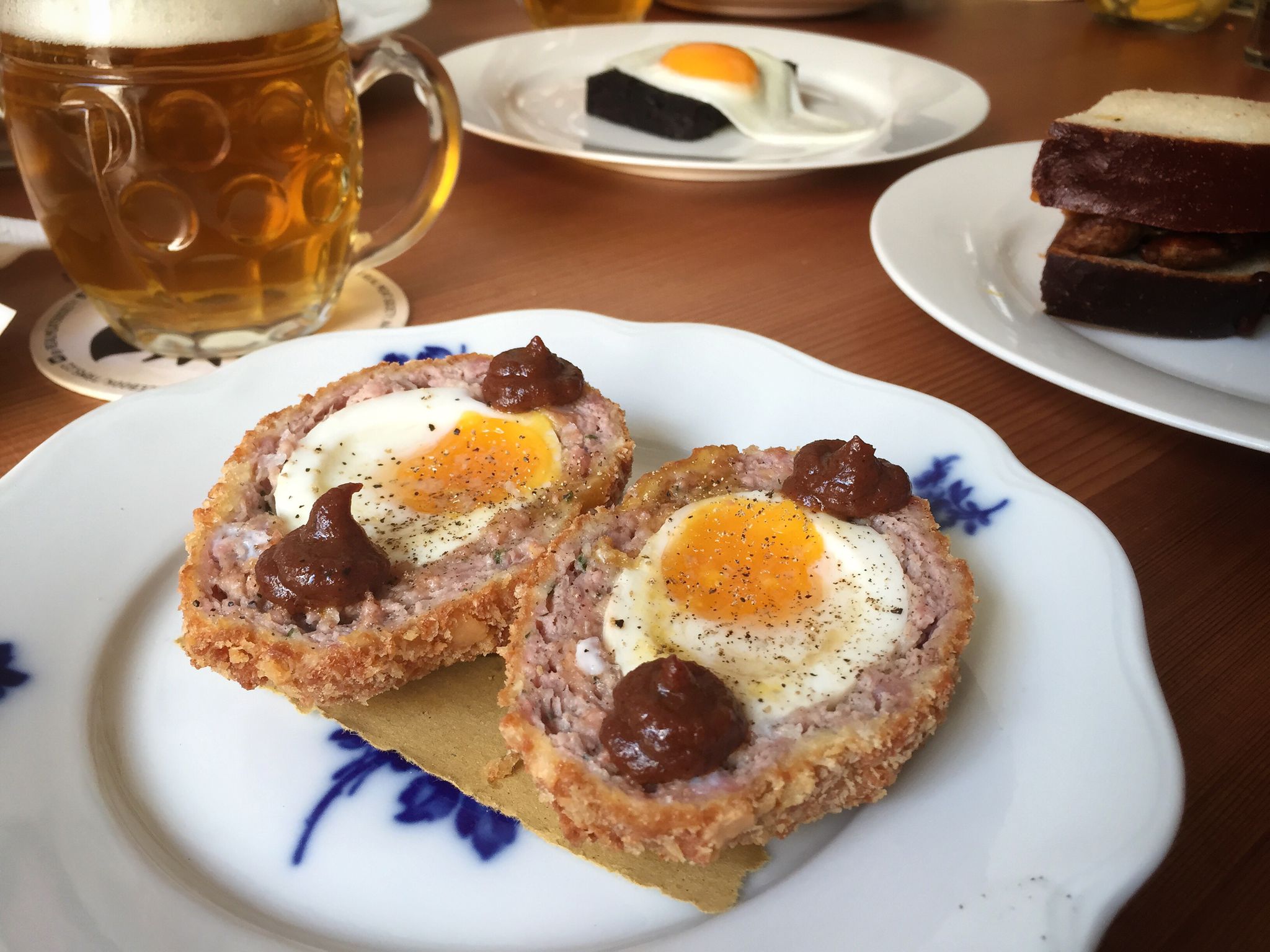 Spokojená návštěva. Jejich signature skotská vejce už asi každý poznáte, ale co je to ten černý obdelník pod vajíčkem? Brownie to teda není.