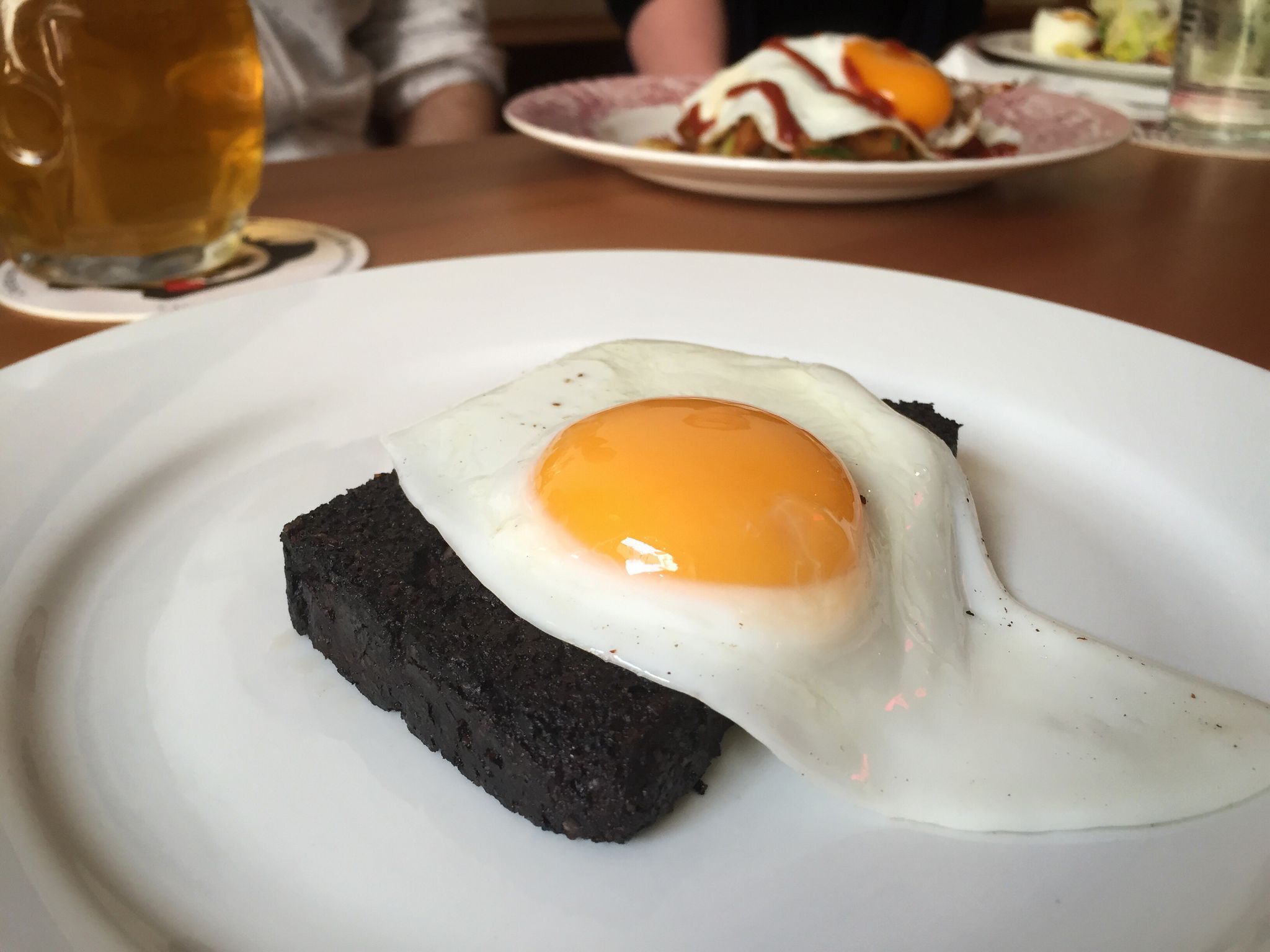 Nová položka na menu – blood cake! Příbuzný českého jelita. Jemnější, jinak ochucený a s roztékajícím žloutkem nebezpečně dobrý.