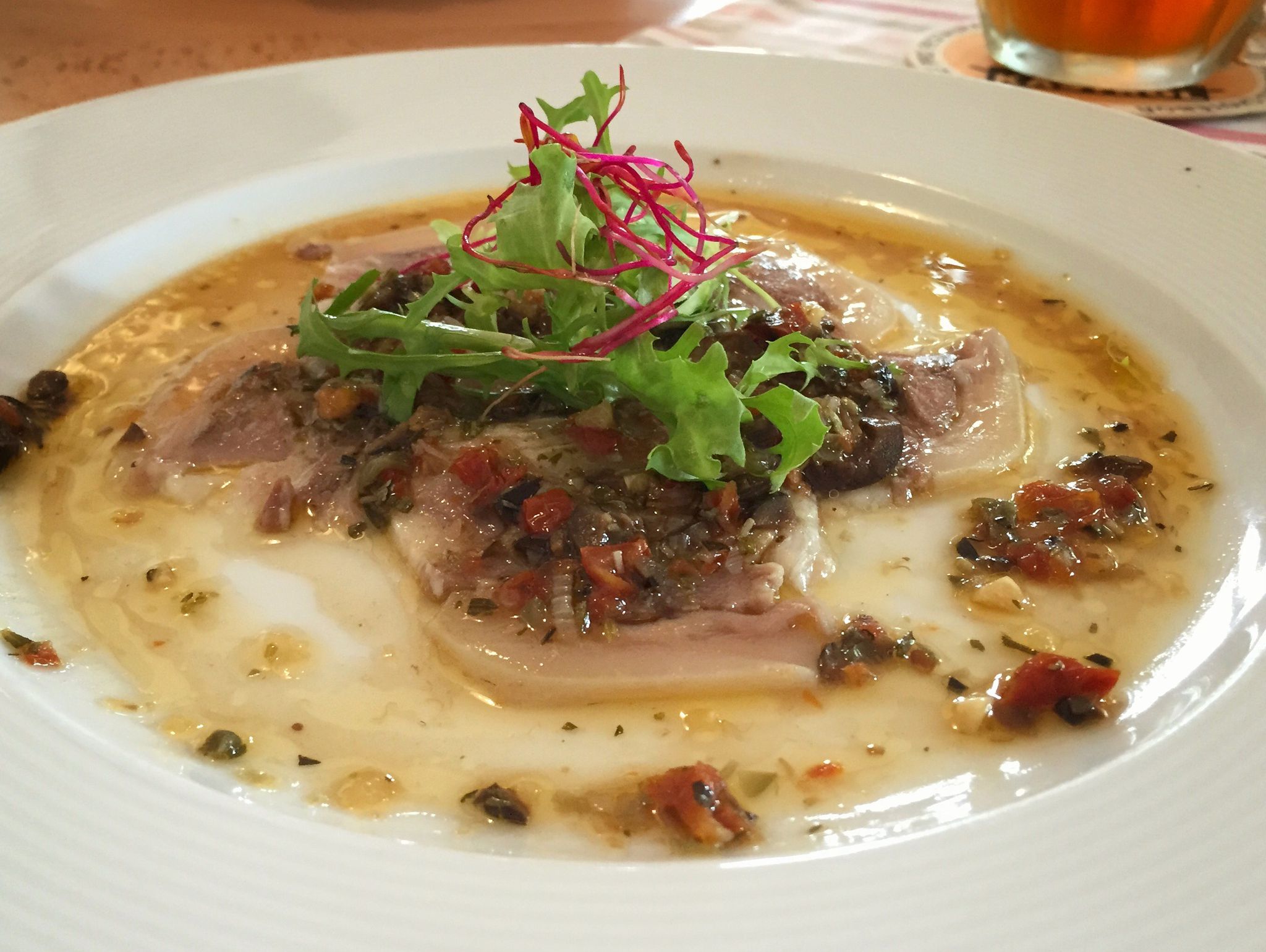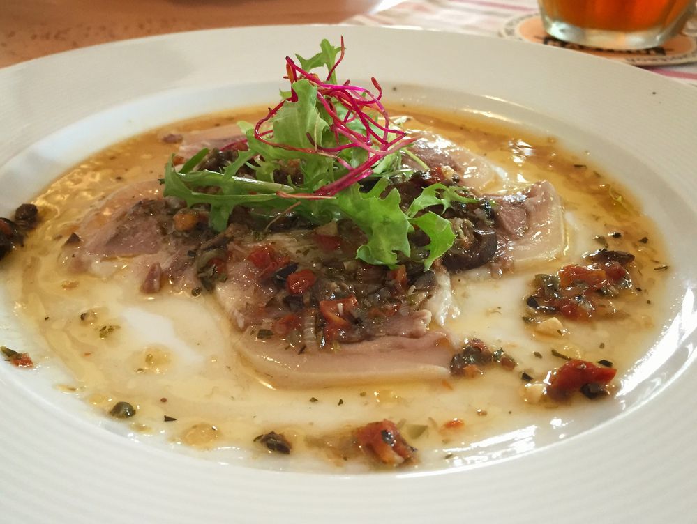 Nečekejte žádnou zamaskovanou tlačenku s cibulí. Jemné maso se spoustou želatiny totiž podávají nakrájené na teňoučké plátky, za tepla (takže želatina i tuk krásně povolí) a s výrazně ochuceným vinaigrette se sušenými rajčaty. Podobné jídlo nikde jinde moc neuvidíte, takže doporučuji! Dali ho teď i na stálé menu.