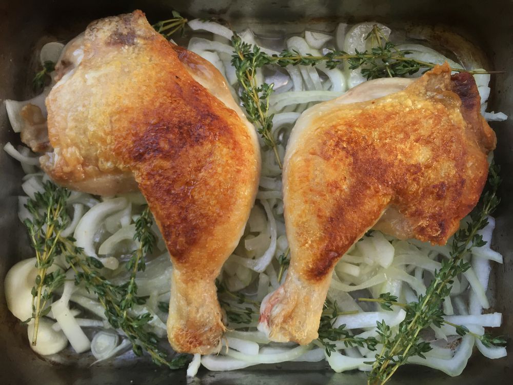 Kuře se peklo na směsi oleje, másla a kuřecího tuku (který se mi vypekl při přípravě kuřecího základu ze skeletu) zhruba 8 až 10 minut. Potom otočit, do ničeho nešťouchat, nepodlévat (!) a dopéct v troubě.