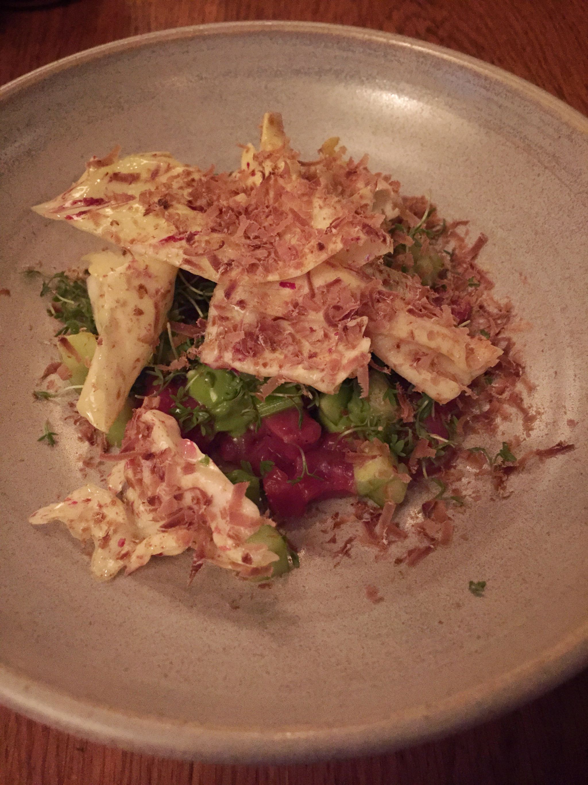 Poslední zastávka u poníka - mladšího bráchy Kadeau. Živý neformální podnik a nová nordická v jednom. Na fotce je nejpovedenější chod – tatarák s okurkou a majonézou z potočnice. To nahoře je salát se sušeným nastrouhaným hovězím srdcem.