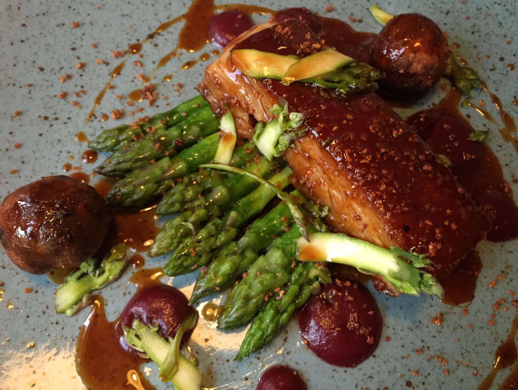 Potom super měkké selečí s vykřupanou kůrkou (350 Kč), krokety z líčka a k tomu krásný zelený chřest. Tohle mě hodně baví – silné chutě z masa a mezi nimi lehké jarní problesky.