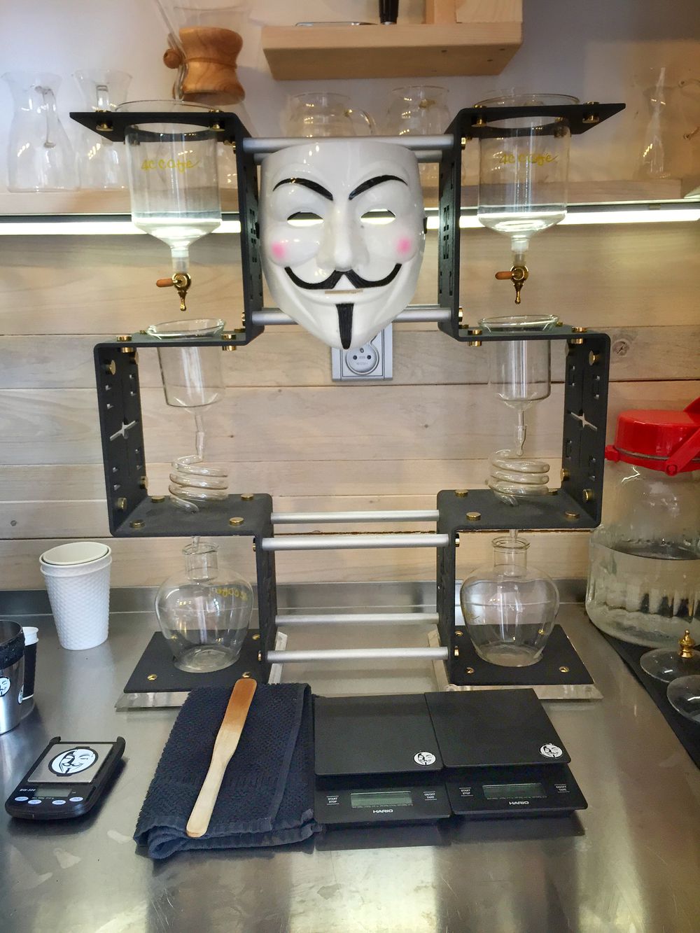 Připravují ho na japonské cold drip koloně na pomalé překapávání (mrkněte na foto). Voda z tajícího ledu v ní kape skrze namletou kávu několik hodin (tady konkrétně 6 h). Hotovou kávu pak lahvují do tmavých plastových lahviček s objemem 250 ml (á 69 Kč).
