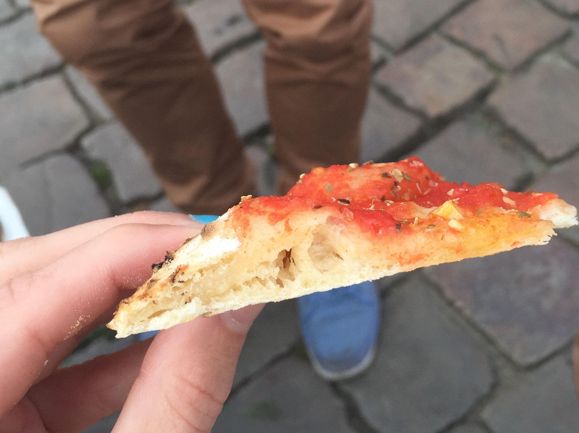 Pizza je pečená hodně rychle a s černými puchýři po okrajích. Oba kusy jsme ale chytili s nedopečenými okraji s proužkem syrového těsta uvnitř. Zkušený profík na pizzu by jim asi dovedl přesně poradit, kde je v kynutí nebo pečení chyba.