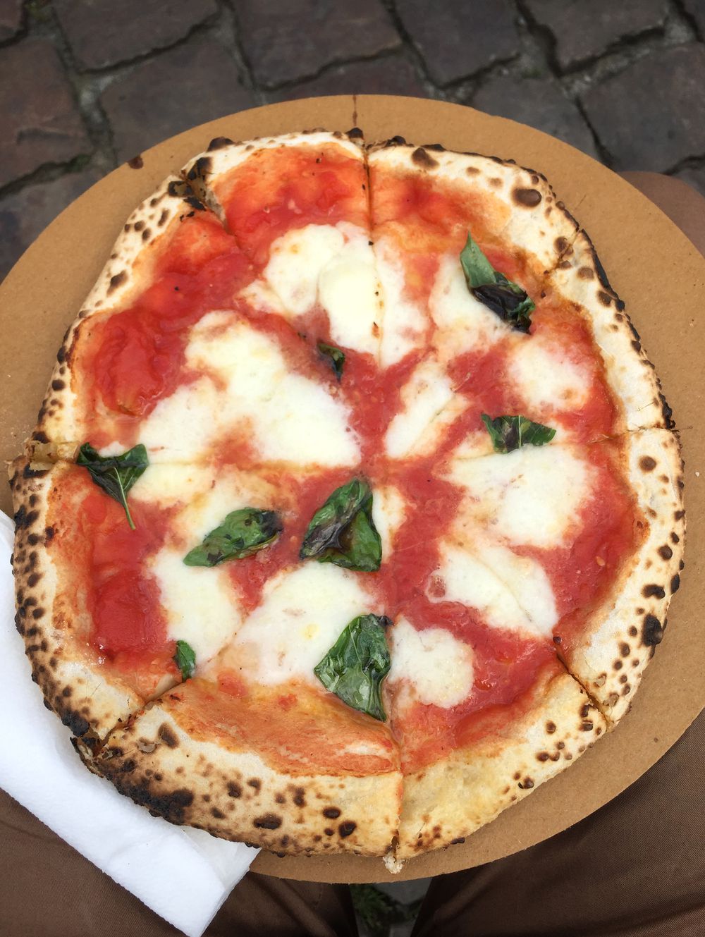 Dostal jsem po ochutnávce u Frankieho ještě několik tipů na pizzu od Albrecht street food circus. Měli dnes zrovna pec na náplavce, tak jsem stihl i ochutnat. Pěkně marinaru (129 Kč) i margheritu (169 Kč, dražší verze s buvolí mozzarellou) stejně jako v sobotu.