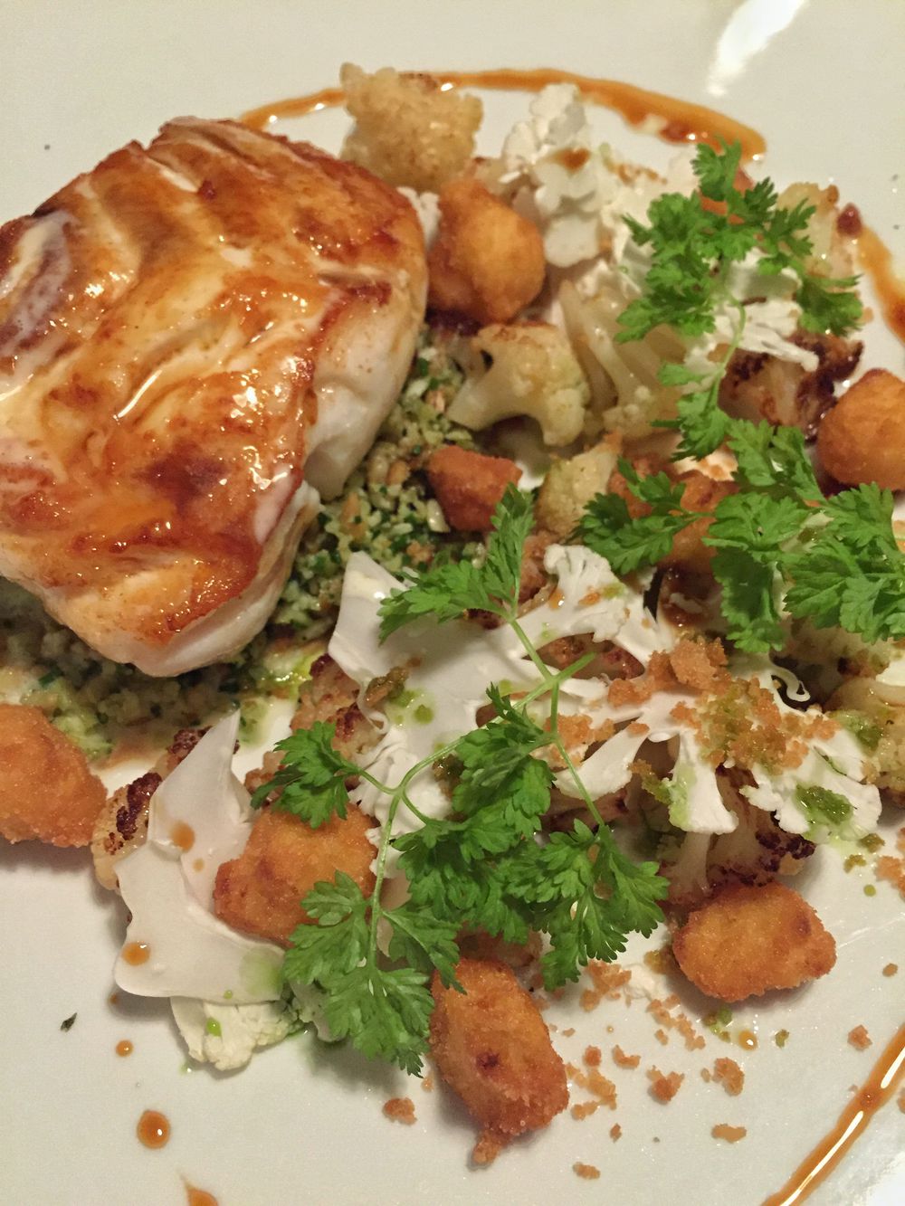 Spočítáte všechny podoby květáku na fotce? K úžasně šťavnaté tresce (420 Kč) to šlo perfektně dohromady. Na menu je i nový předkrm s holubem (230 Kč), ten jsem si ale ani nestihl fotnout, jak byl dobrý... :)