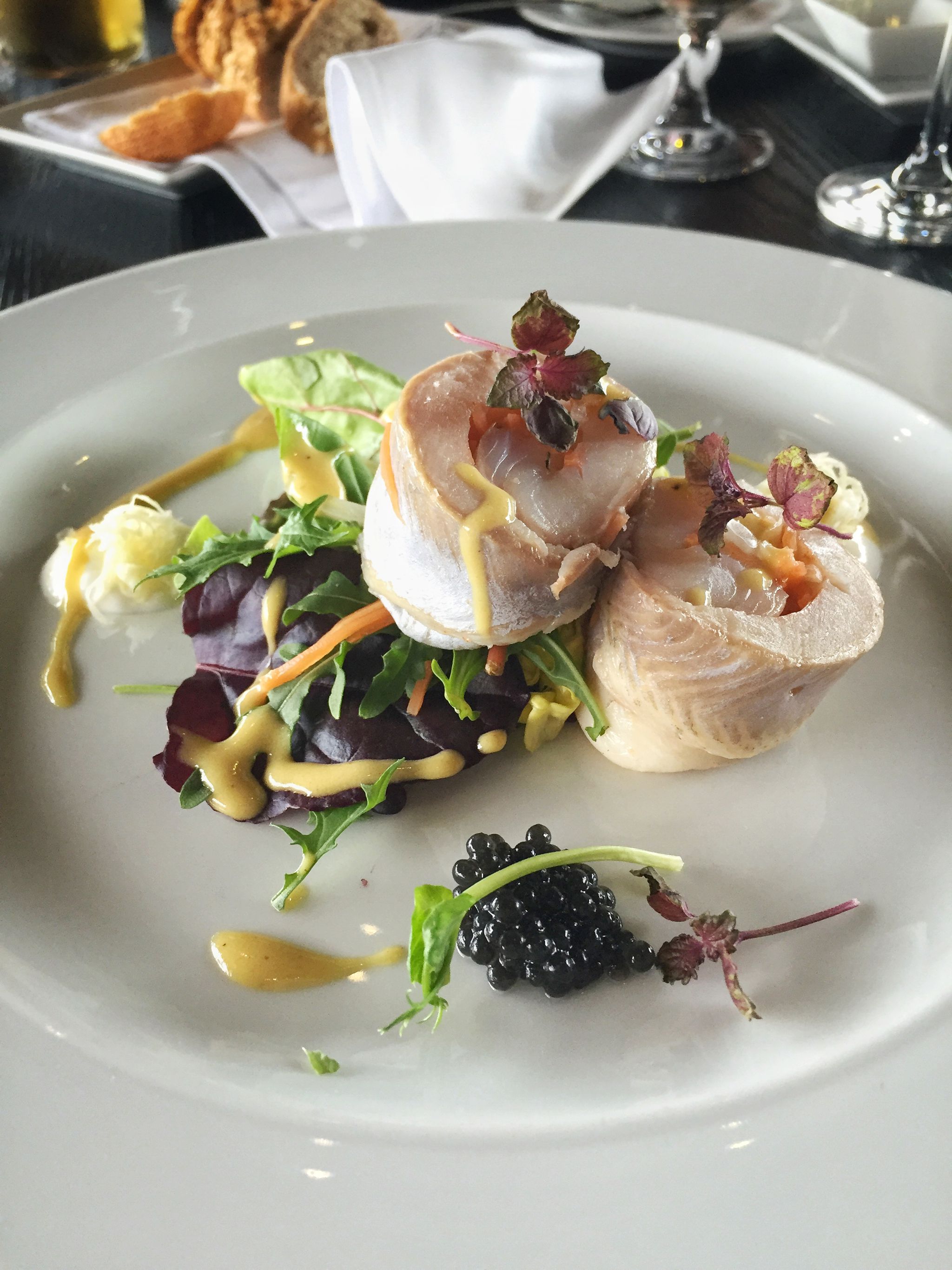 Perfektně poladěný zavináč z marinovaného pstruha s fenyklem a křenovou smetanou (230 Kč). Maso ryby tak akorát - nerozmáčené marinádou, pevné ale ne syrové. Asi nejlíp udělaný pstruh za delší dobu.