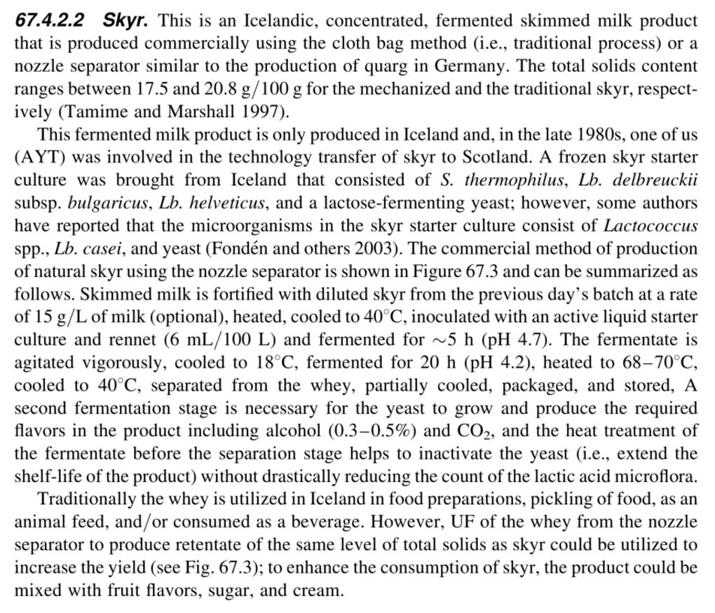 Vyrábí se z odstředěného mléka, do kterého se přidají kultury se sýřidlem. Skyr pak prochází dvojí fermentací a ke konci ještě vykapáním v plátně (tradičně) nebo separací tryskou (průmyslově), což mu dá tu správně hustou konzistenci. Klik pro celý proces výroby (výstřižek je z Wiley Handbook of Food Products Manufacturing).