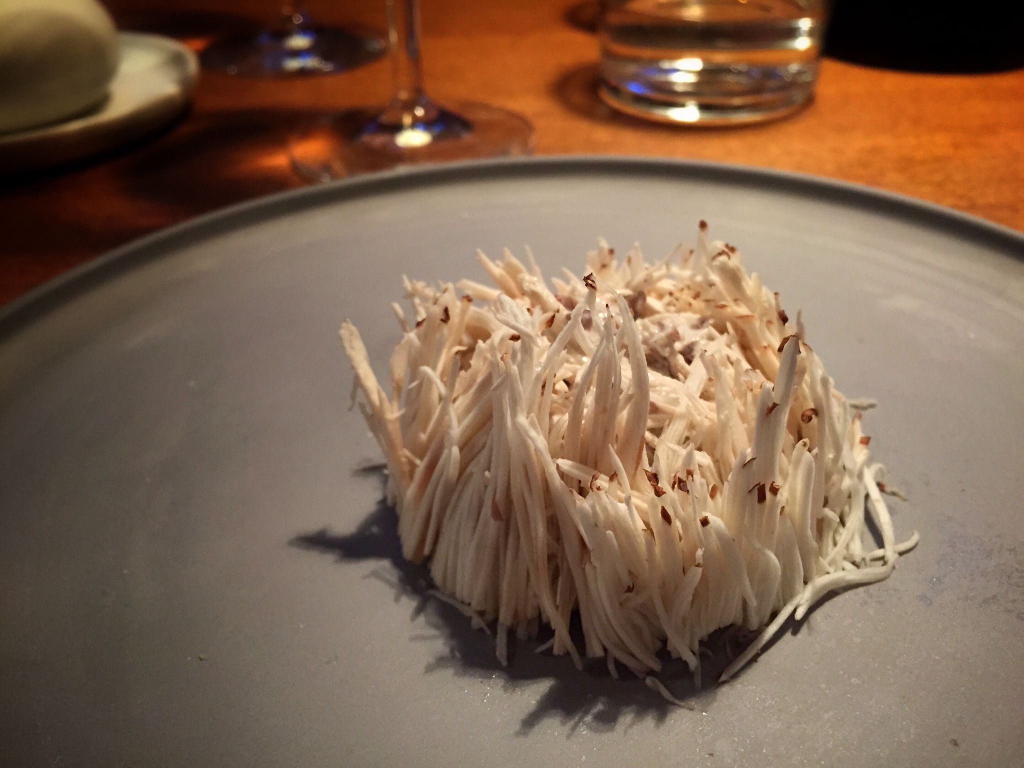 Hnízdo z tenkých nitek portobella. Ve středu se ukrývá pyré z topinamburů a artyčoky. Jemné zemité chutě a hlavně hra s texturou. Je neuvěřitelné, co s houbou udělá takhle jemné nakrájení.