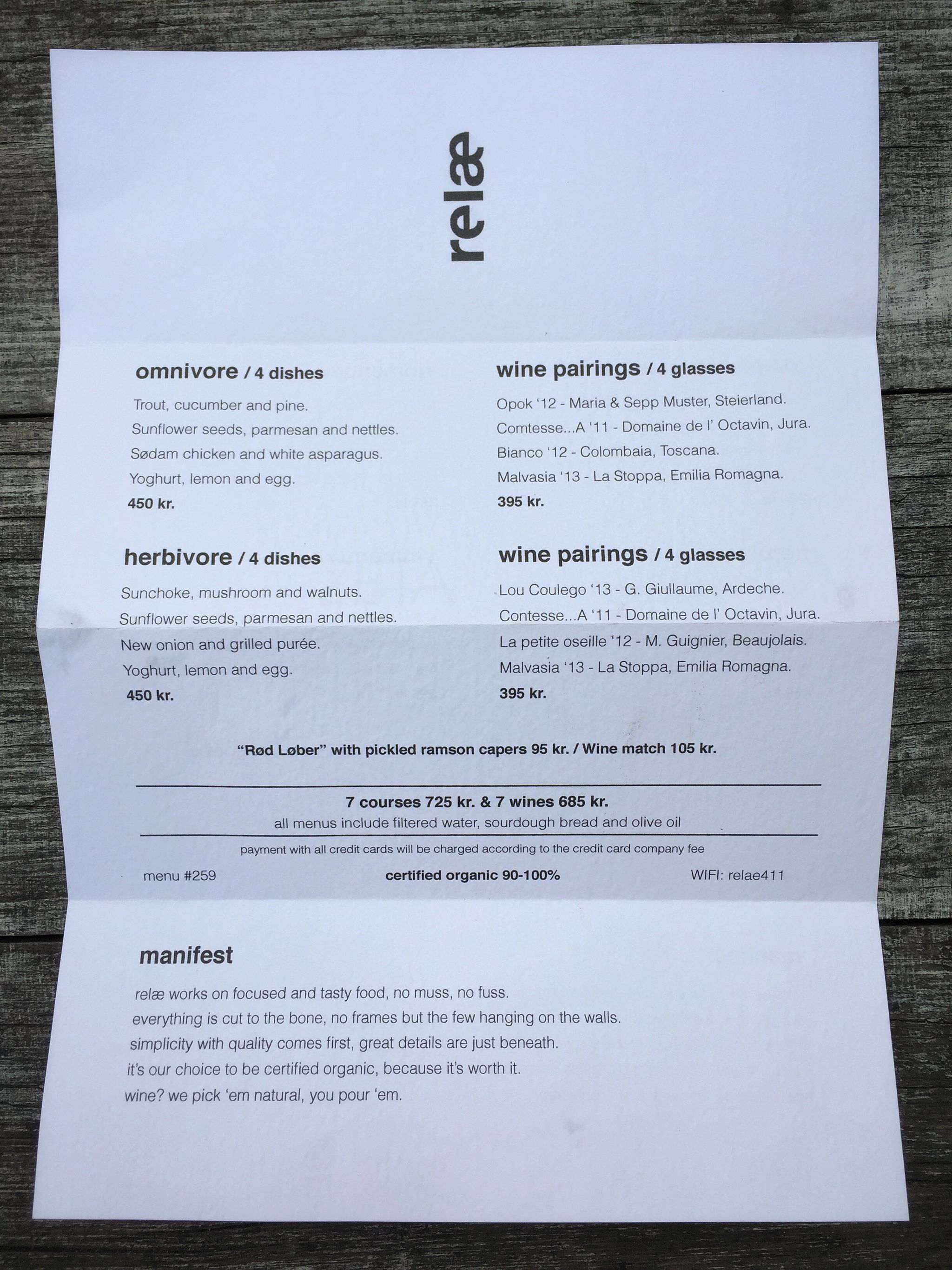 Ceny v Relae malinko stouply (v roce 2011 stálo stejné menu 345 DKK). Vzhledem k úspěchu a popularitě se ale vůbec nedivím. Jídlo drží pořád stejnou úroveň. A při porovnání s poslední návštěvou mám dojem, že hodně zamakali i na servisu. Celý večer měl úžasný tah a dohromady to vytvářelo takový ten vzácný pocit, kdy jídlo, místo i lidé okolo dokonale souzní.