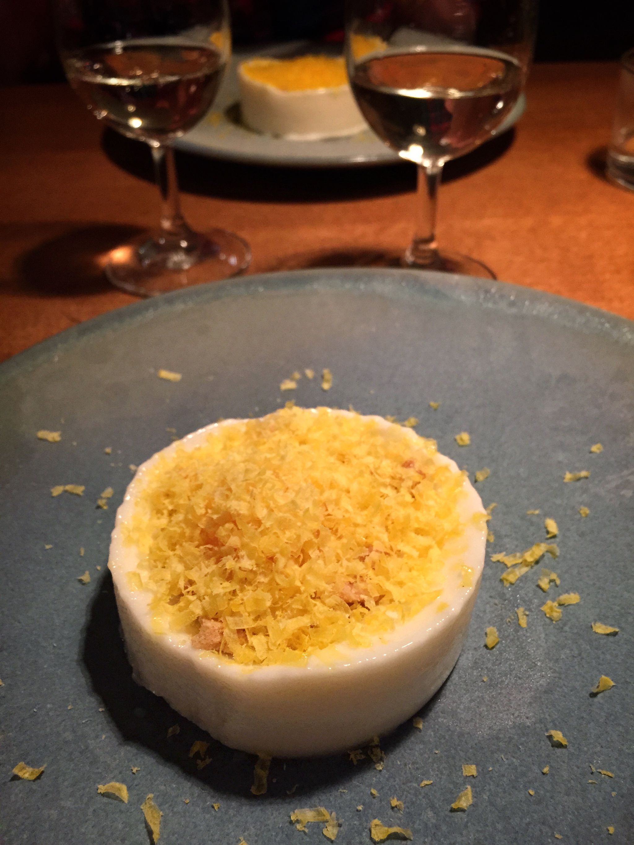 Příklad moderního dezertu a taky jeden z nejlepších, co jsem měl za pěkně dlouhou dobu! Jogurtová zmrzlina, citronová kůra, nalámané máslové sušenky a uvnitř ještě zakuklený teplý žloutek.