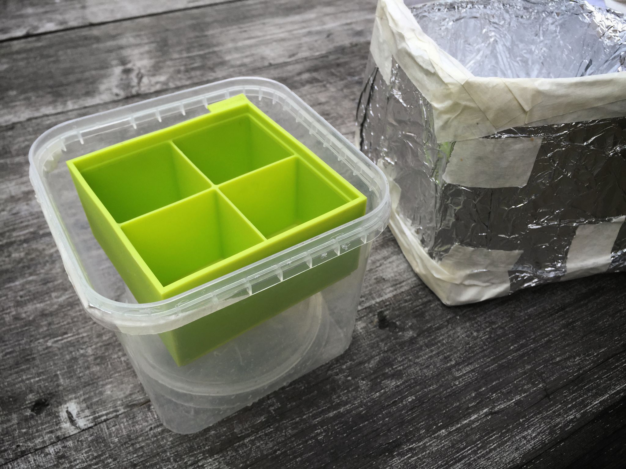 Já jsem na pokusy použil obyčejnou plastovou nádobku (1000 ml), kterou jsem neumětelsky oblepil bublinkovou fólií, lepenkou a alobalem. Výborná by byla i malá chladnička do auta, tu ale doma nemám. Když jsem do takto oblepené nádoby dal vodu a nechal mrznout přes noc (při -18 °C), získal jsem krásný čirý led asi do půlky nádoby a dole bublinu s dosud nezmrzlou vodou.