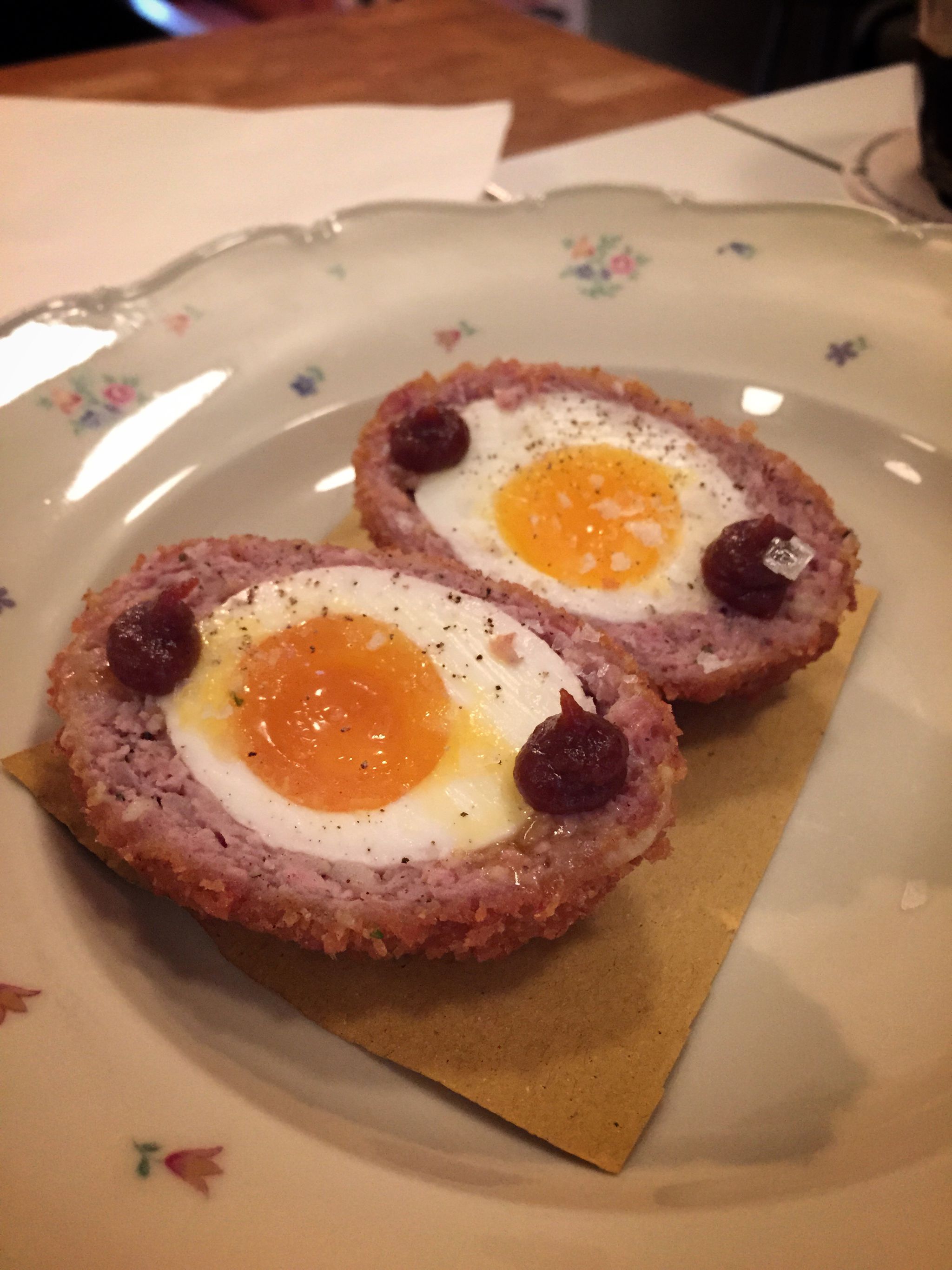 Obligátní skotská vejce byla samozřejmě taky (myslím, že už natrvalo usazený signature dish Koblihy). Paní u vedlejšího stolu nad nimi dokonce jásala – jé, vejce v chlebu! No tak těsně vedle, no... :)