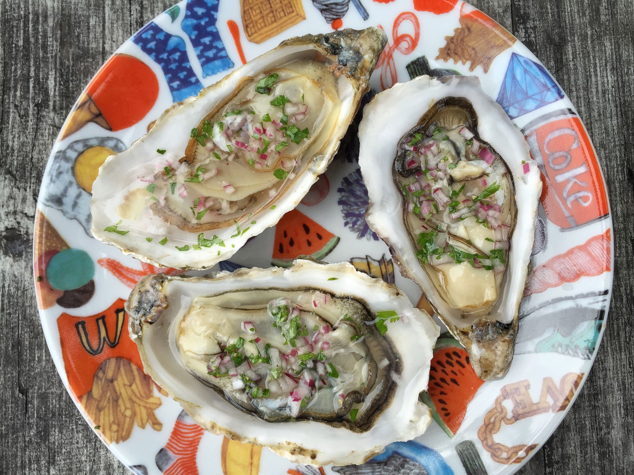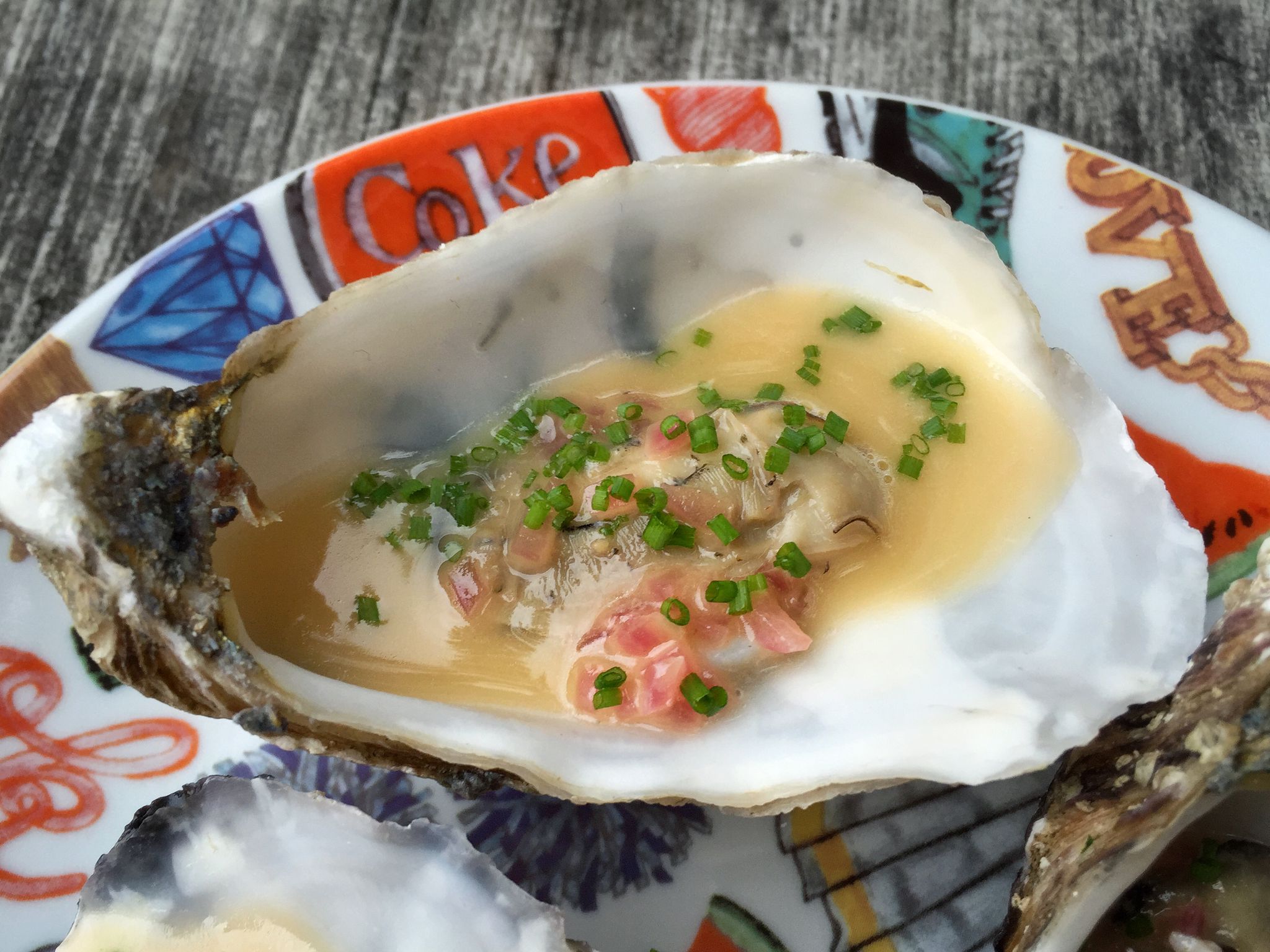 První ústřice jsou se šalotkou, koriandrem a cider octem. Ta druhá v detailu je pošírovaná. Začal jsem svařením octa, piva a šalotky na sirup. Přidal jsem studené máslo, rozmíchal a povolil šťávou z ústřic. Pak už jen přidat ústřice, nechat prohřát a šup do lastury.