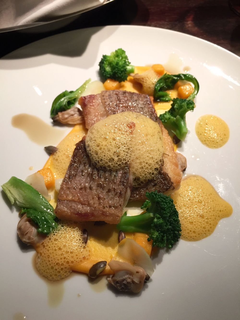 Spokojená návštěva, ale jen o prsa. Byl jsem hodně na vážkách a na konci vlastně i trochu otrávený. Sashimi i přes přítomnost sushi chefa mírně subpar (alespoň, že čerstvost ok). Hlavní rybí chody nebyly technicky blbě, ale nemělo to drive, jaký bych za tu cenu čekal (570, respektive 420 Kč). Třeba zrovna bílý vlk, vongole, dýně a brokolice co je na fotce. Ryba skvěle udělaná i ochucená, k tomu ale omáčka i pyré úplně bez jiskry. Zelenina i mušle bez jakéhokoliv propojení a oba talíře s rybími chody nepříjemně rychle chladly.
