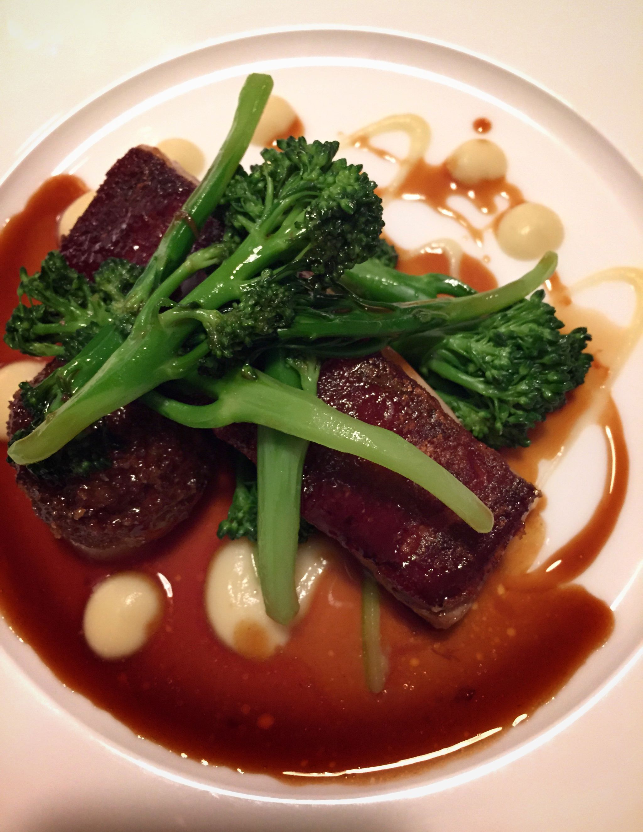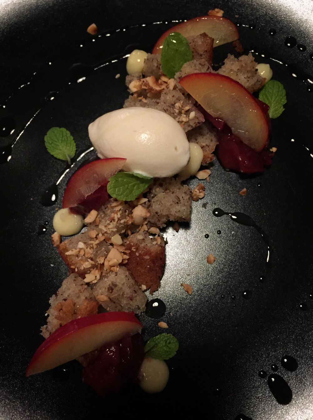 Spokojená návštěva. Selečí bůček, brokolice a jablečné pyré (285 Kč) – baví mě, jak se tady jídla pořád mění (při první návštěvě byl selečí bok s čočkou a mrkví). Dezert je financier se švestkami, citronem a líškovými oříšky (180 Kč). Vypadá to jako hromádka s rozbitou vídeňskou vánočkou, je to ale setsakramentsky dobrá hromádka.