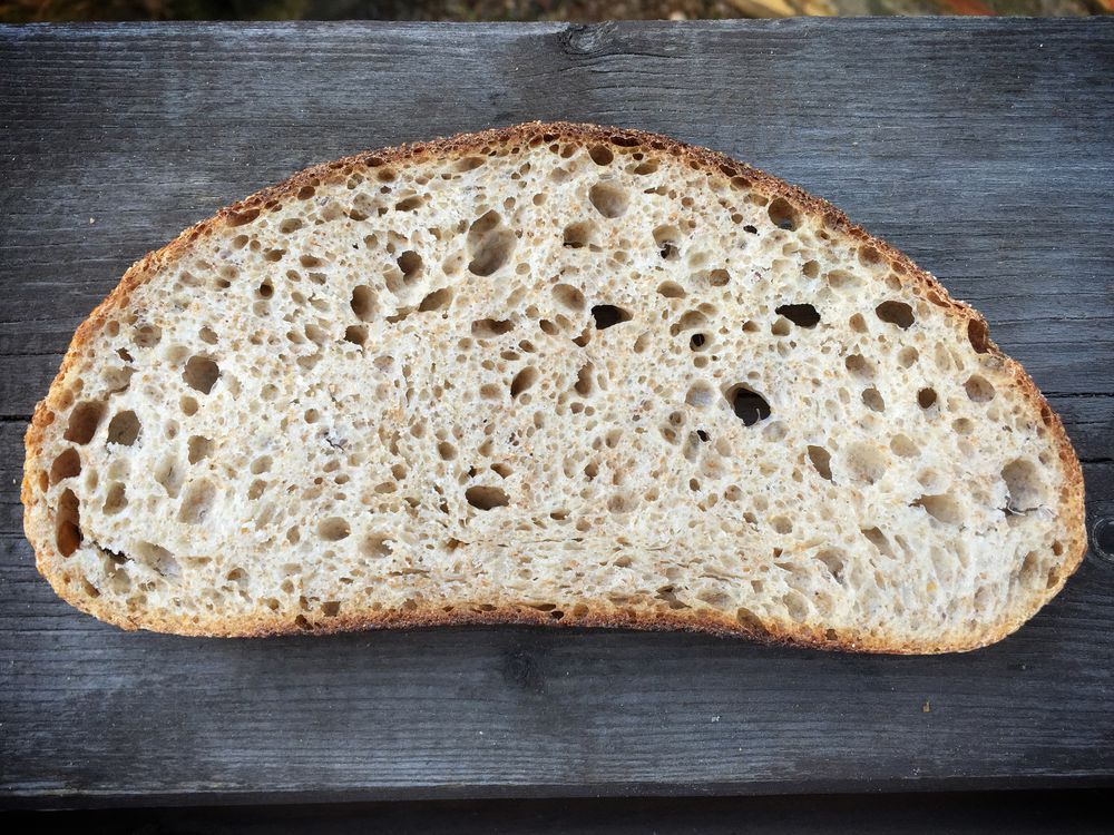 Výsledek je krásně krémová, voňavá a vlhká střídka plná bublin (zároveň ale s dobře vyvinutou kůrkou). Ta krémovost střídky a vůně po čerstvé pšenici se snad ani nedá popsat. Ve srovnání s tímhle domácím chlebem mi pak všechny koupené připadají suché a bez chuti. A to ani nemluvím o pokusech s celozrnným pečením, kde jsou u nás normou totálně překyselené, rozpláclé a hutné chleboplacky.