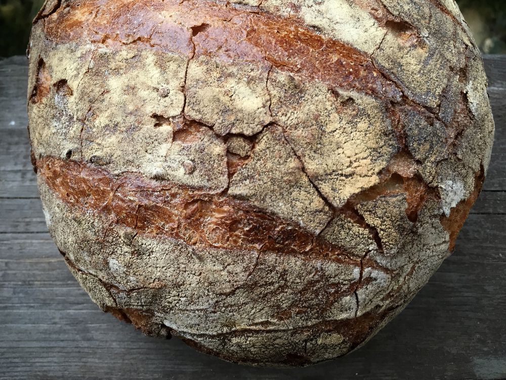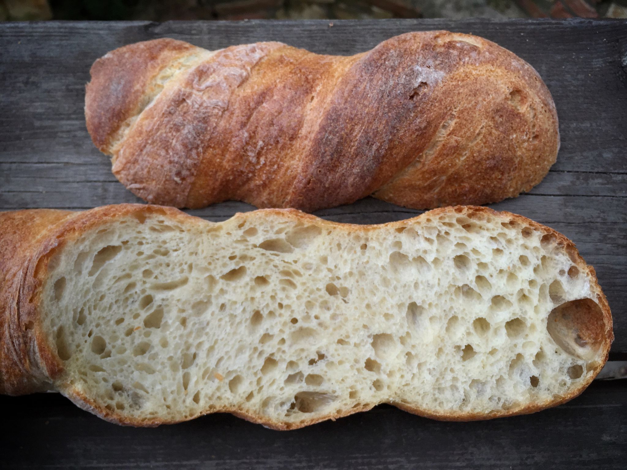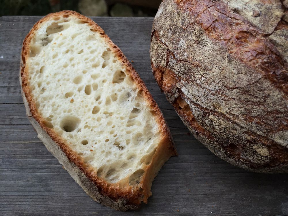 Druhý na fotce je jejich maltézský chléb (39 Kč). Také pšeničný a s efektně vykřupanou kůrkou, která praská přímo ukázkově (jako sklo). Střída mi přišla přesolená a hlouběji v pecnu i nerovnoměrně nakynutá (část uzavřená, část plná obřích bublin). Ale znovu – když to dám (cenou a výsledkem) vedle několika aktuálních řemeslných chlebů, tak se Breadway opět v pohodě drží.