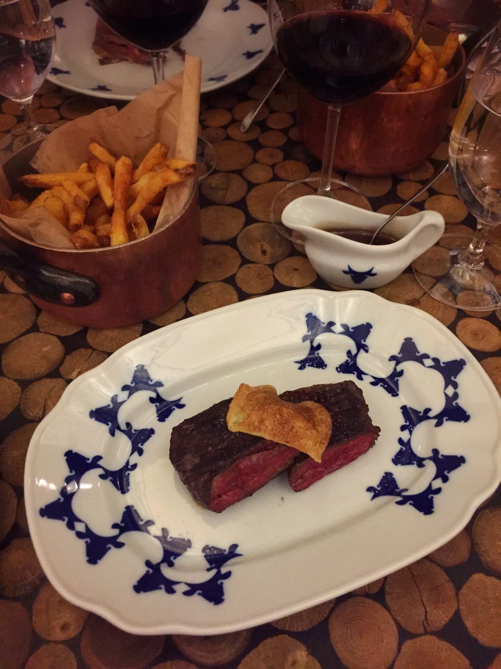 Tatarák, oponka medium rare, perigordská omáčka, hranolky. A na finiš jak jinak – buchtičky. Uznávám, objednávám jak důchodce!