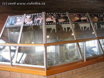 Na obrázku výše vidíte technické řešení. Sýrárna je umístěna v prvním patře, v druhém je vybudován ochoz s prosklenou stěnou, která umožňuje návštěvníkům sledovat dění dole. Patro pro veřejnost mimo jiné obsahuje restauraci, obchod a různé výstavky kýčovitých suvenýrů včetně živé babičky, která maluje krávy na 100 způsobů ;) Pozor, sýrárna není jen na ukázku jedná se o běžný provoz. Sýrárna zpracuje denně 17-20tis. Kg mléka, vyprodukuje 240-320 7kg bochníků sýra (ročně cca 10200 kousků), mléko sýrárně dodává celkem 17 místních (přímý dodej) a 27 vzdálenějších farmářů v tankerech. V sýrárně bylo velmi živo, ochoz byl plný návštěvníků, kteří stejně jako my bedlivě pozorovali proces výroby ;)