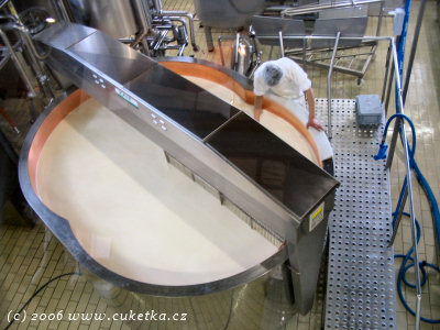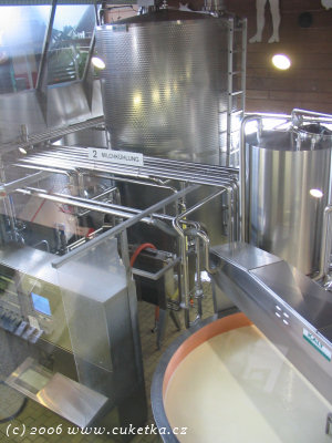 Na tomhle obrázku (omluvte kvalitu, foceno přes sklo) vidíte vlevo nahoře obrovskou káď s mlékem, kde se připravuje mléko. Dole vvlevo centrální počítač, který ovládá celý proces, vpravo dole pak okraj kádě pro zpracování sýřeniny. Mléko je ihned po příjezdu podrobeno odběrům, pro ověření kvality – nežádoucí mléko je vyžazeno. Po změření objemu dovezeného mléka následuje filtrace (tu jsem neviděl). Mlékař následně pomocí kompjůtru odměří správné množství mléka pro výrobu jedné várky sýra (80 bochníků).