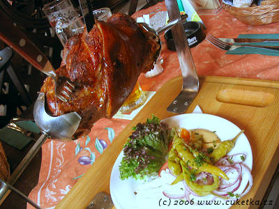 Koleno bylo výborně propečené, v jídelníčku uvádějí, že i naložené v černém pivě. Chuťově výborné a docela šťavnaté. Na povrchu však mělo maso docela tvrdou kůrku, navíc kůžička byla na některých místech spečená na tvrdost ideální pro vylomení zubu. Přesto se jí našel dostatek v tzv. křupavém optimu ;) Rovněž kvalitního a na jazyku se rozpadajícího sulcu bylo zdostatek. V porovnání s kolenem z Hajnovky bylo lepší. Ale pořád to vidím na osm cuketek z desíti, což si odpyká Hajnovka downgradem na sedm cuketek.