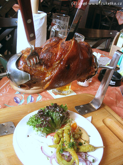 Pečené koleno nabízejí velmi levně za 16,- Kč / 100g. Doba čekání cca 45 minut. Koleno servírují v speciálním preparačním svěráčku přimontovaném na dřevěném prkýnku, probodnuté steakovým příborem, spolu s talířkem smetanového křenu, hořčicí, nakládanýma papričkama, cibulí a troškou zeleninové oblohy. Samozřejmostí je ošatka s pečivem. Pozitivně mě překvapila role jednorázových papírových utěrek – plus body a dobrý nápad. Komu nestačí titulní foto, tady je pečené koleno na dalším explicitním obrázku.