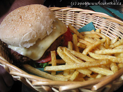 Další problém byl s akcí americké kuchyně, kde na jídelním lístku inzerovaný moučník zdarma při objednání hlavního jídla (v našem případě hamburger) odmítl doborvolně zavítat na náš stůl. Obsluha nejdřívě tvrdila, že je to v pořádku a dortík přijde. Potom názor změnila a tvrdila nám, že dostaneme pouze nápoj zdarma. Po krátké výměně názorů nám navrhla alternativu, což jsme odsouhlasili. No, nakonec ještě jedne kotrmelec a na našem stole přistály dortíky hned dva ;D