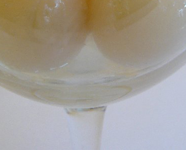 nejaké ovocie v stopkovom pohári — ale aké??? hm, lychee, zavárané čerešne? žeby sangria?