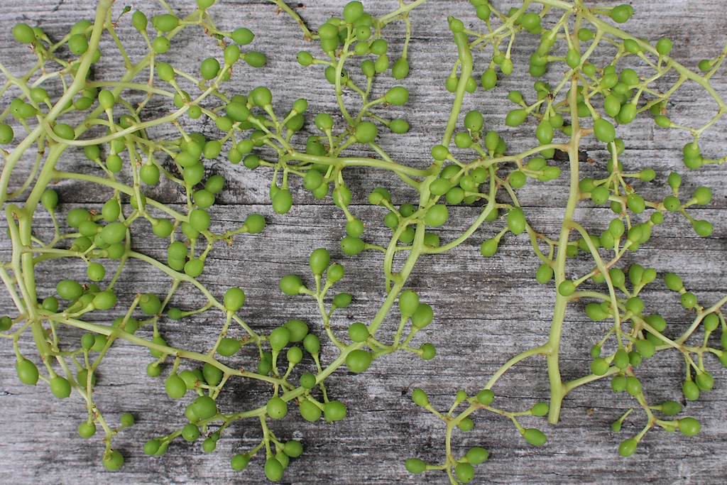 K bezinkám jsem na zkoušku přidal ještě nezralé bobulky vína. Stejně jako bezinky se v soli parádně rozjedou a začnou pěkně vonět. Obojí se v soli zcvrkne a postupně ztratí jasně zelenou barvu. Jak to bude dál, zatím nevim. Budete muset počkat se mnou, nebo vyrazit pro vlastní bobule!