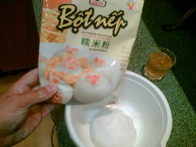 Obchodník ze Sapy mne poznal a okamžitě se zeptal, jak mi chutnaly naposledy zakoupené krevety a jak mi krájí nůž, což je velmi milé (to se v hypermarketu stát nemůže..). Mimo nudlí, čaje, ochutnávky exotického ovoce (40 kg druh ježatého melounu chutnající po ananasu a banánu) uff, nákupu ovoce podobného liči, ale sladší, dle Vietnamky „dobrý na krk“, můj zrak mimo jiné padl na pytlík, na jehož obalu byl knedlík. Plněný. Firma TÁI KÝ, HÁNG VIĚT NAM, GLUTINOUS RICE FLOUR, pak znaky, hodně reklamních slov jako Ám thúc dóc dáo Bác bó, zvlášt předposlední ryze české bác utvrdilo myšlenku na knedlík. Jedl jsem místní smažený knedlík tenkrát s Cuketkou, Rachadem, Cutie a Klárou, prý je také z rýžové mouky.