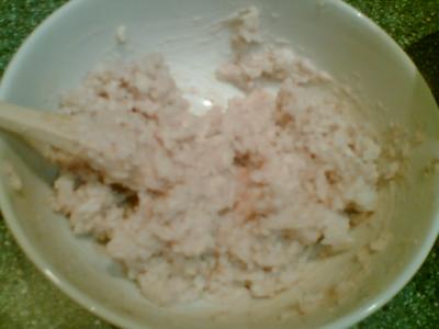 Do rýžových knedlíků patří rýže (paradox), základ tvořilo mléko, rýže, trocha cukru, skořice a lžíce přírodního jahodového sirupu. Náplň je libovolná, tuto vaříme tak dlouho až je hmota podobná známé mléčné rýži, která se prodává v obchodech.