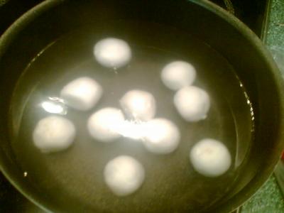 Máme tedy těsto a náplň, pro zjednodušení jsem nepřidával nic jiného, neznal jsem výsledek, jsem rýžoknedlíkový panic začátečník. 16-ti gramové knedlíčky jsem ručné plnil rýžovoskořicovou směsí, dělal malé knedlíčky. Mezitím se vaří voda a do druhého hrnce dal rozpálit olej, dvojvariantové jídlo. (miniknedlík úplně nahoře sloužil na testaci oleje)