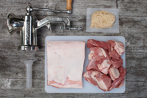 Co všechno potřebujete, abyste tu parádu mohli rozbalit doma? V zásadě pouze obyčejný mlýnek na maso, nástavec pro plnění do střívek a přírodní vepřová střívka. To jsou jediné absolutně nezbytné věci pro výrobu. Jinak vystačíte s běžnými surovinami a kuchyňskou výbavou.