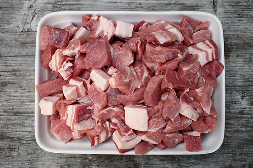 S několikahodinovým předstihem nakrájejte všechno maso na asi dvoucentimetrové kostky. Maso dejte do mísy nebo na pekáč a vmíchejte do něho sůl, pepř a muškátový oříšek. Vše důkladně promíchejte, zakryjte potravinářskou fólií a nechte uležet v lednici (minimálně na dvě hodiny).