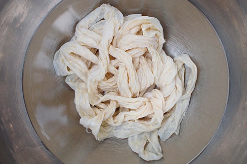 Přes noc odmočená střívka si dejte do velké mísy a do umyvadla. Opatrně ale důkladně je propláchněte vlažnou vodou z kohoutku (nesmí mít více než 40 stupňů). V klidu si je rozmotejte. Nebojte se je nasadit na kohoutek a opravdu důkladně projet vodou. Ve vlažné vodě je nechte ještě cca půl hodinky odležet.