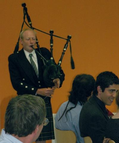 Otevřely se dveře a dovnitř vstoupil nejprve skotský dudák, za ním kuchařka nesla tác s nazdobeným haggisem a průvod uzavíral řečník.
