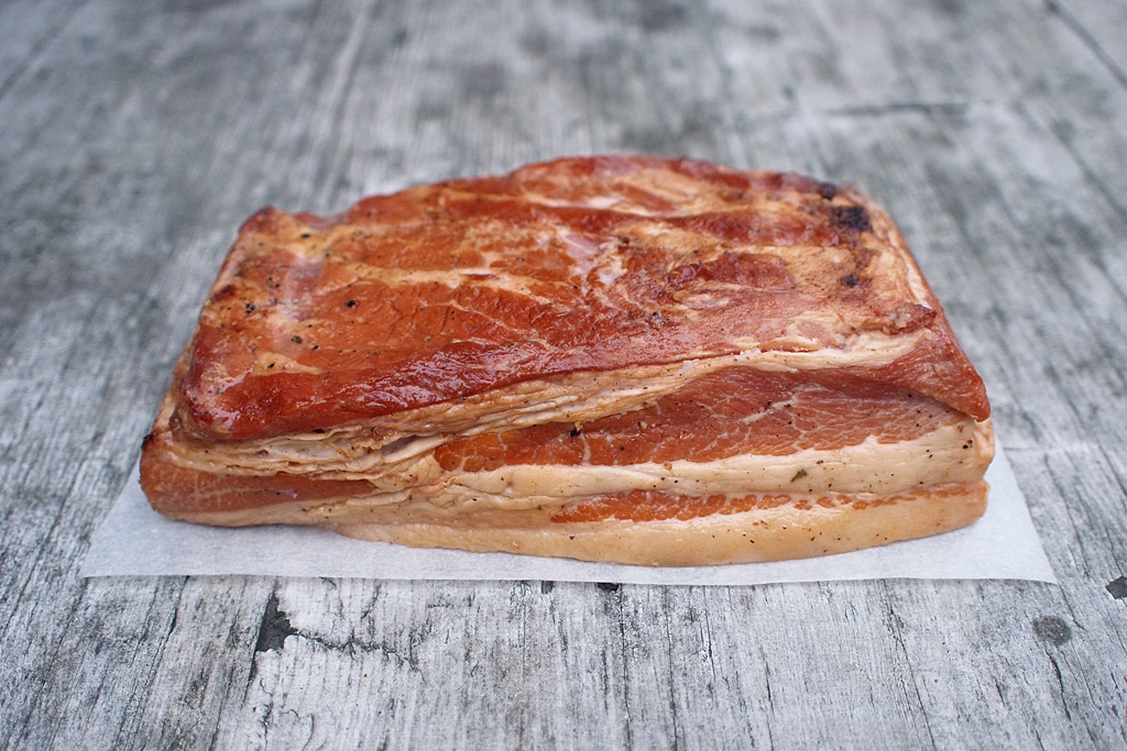 Bůček jsem udil asi půlhodinu z obou stran. Díky tomu, že byl dost vysoko, nepustil ani kapku tuku do žhavých uhlíků a na povrchu se jen mírně prohřál. Z uďáku jsem ho šoupnul rovnou do trouby vyhřáté na 95 stupňů a počkal něco málo přes hodinku, než jsem ve středu naměřil 65 stupňů. Slanina na konci nemá tak výraznou uzenou chuť (není prouzená durch), kouř tam ale je a pokaždé když dáte slaninu na pánev, pěkně se připomene.
