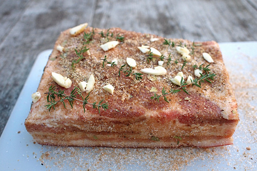 Po sedmi dnech bůček vyndejte z pytlíku. Zbytek marinády umyjte a maso opravdu důkladně osušte. K tepelné úpravě můžete přejít hned, slanina ale ještě klidně vydrží pár dní v lednici. Kdybyste měli k dispozici dostatečně chladnou a dobře větranou místnost, mohli byste nechat slaninu ještě dál vysušit (nezkoušel jsem).
