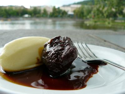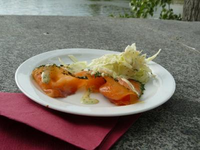 Lehce uzený losos s fenyklovým salátkem, medem a hořčicí – výborné, stejně tak jako dušená vepřová líčka s bramborovým pyré (to se mi nejdříve nějak subjektivně nezdálo, ani nevím proč, ale pak jsem usoudila, že už začínám blbnout a hledám na tom chyby, které tam nejsou).