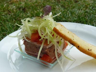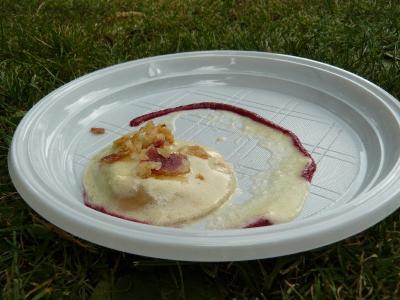 Vybíhám k stánku Hiltonu pro dvě úžasné chuťovky: raviolku s červenpu řepou a artyčokem, to vše s křupavou panchettou (za 1 G, oproti pátku sice podávané na plastikovém talířku, ale to mi vůbec nevadí) a uzený hovězí jazyk v tomatovém komínku (2 G). Super!