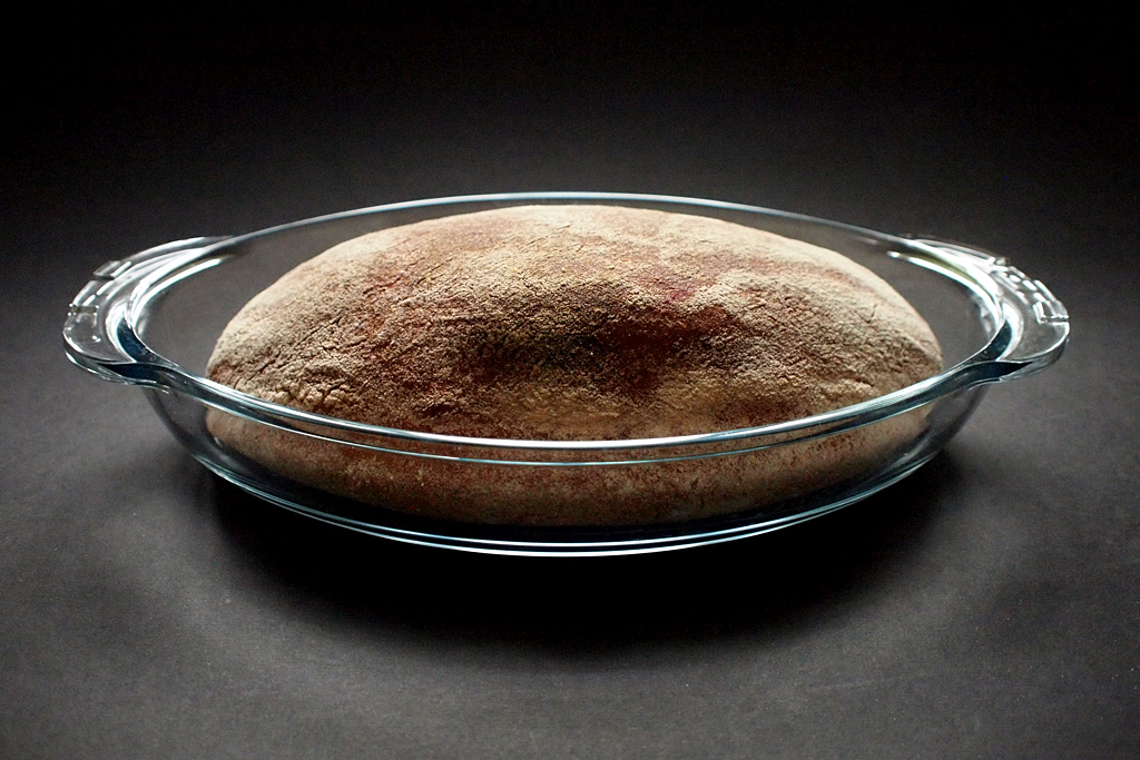 ↪ 15 pan Cuketka: Skleněný pekáč na obrázku má rozměry 32 cm x 20 cm a těsto jsem zvětšoval cca 1,3 x. Kulatý bochník bez změny velikosti byl OK v litináči s objemem 3l a průměru 24 cm.